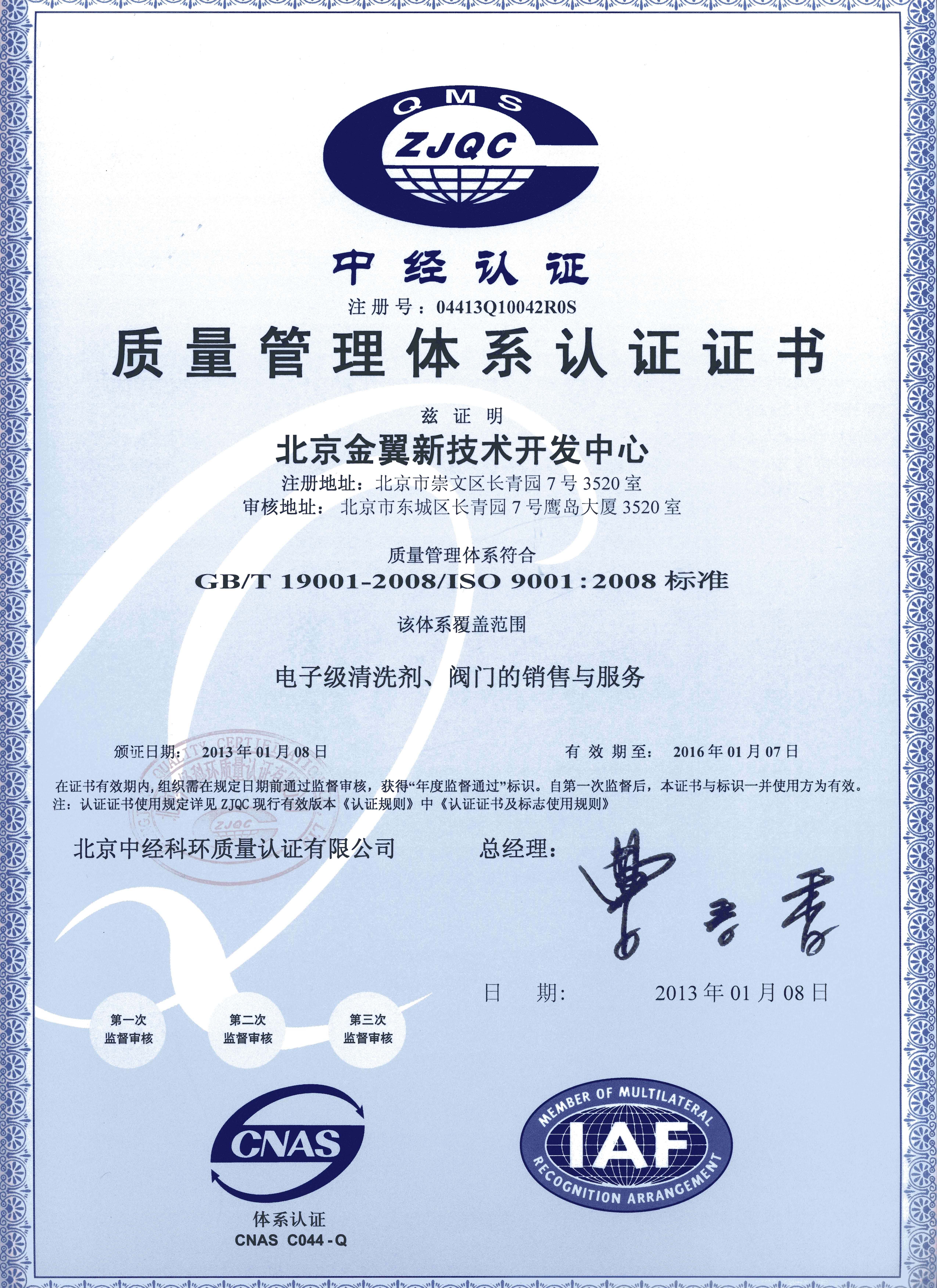 北京金翼新技术开发中心已于2013年1月通过了北京中经科环质量认证有限公司的认证并取得了认证证书。